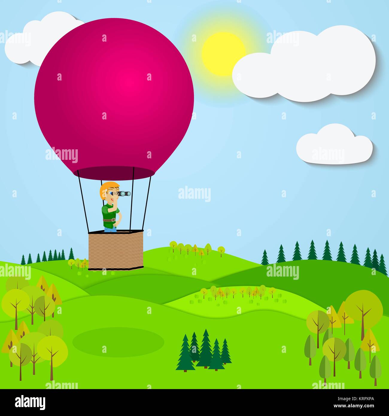 Man Flying Hot Air Balloon Over The A Mountain Landscape Colorful Illustration Stock Vector Image Art Alamy